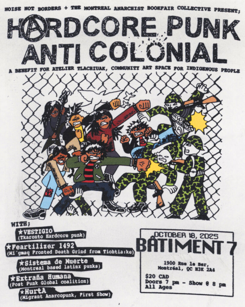 Nous sommes fières.ers d’annoncer que le Salon du livre anarchiste de Montréal reviendra cette année le 18 octobre pour un événement d’une journée au Bâtiment 7 à Pointe-Saint-Charles, sous le thême « Se préparer à l’obscurité : Prendre soin les un.e.s les autres pour les temps à venir ». Il y aura des présentations, des vendeuses.eurs, des activités/un espace pour les jeunes, de la nourriture et de la musique. Restez à l’écoute pour plus de détails à venir!
